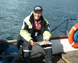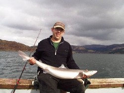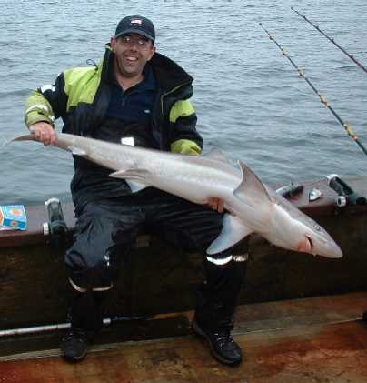 Me with an "Accidental" Male Tope of 50lb, it was accidental because it picked up a skate bait , not that I'm complaining :) |