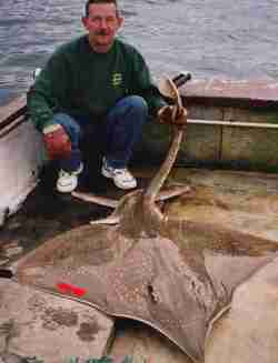 If and when you bring a Skate into the boat, due to their size and shape they can be very difficult to move about : mother nature forgot to fit a set of handles to them. The easiest solutionI have found is a 6' x 4' bit of old trawler netting, simply manoeuvre the fish over the net then you can use it toeasily lift the fish back over the side. (see below) While on the subject of handling the Skate, be very wary of the tail. The large thorns on the tail are razor sharp and the Skate have a habit of putting the tail where you don't want it to be. Another danger area is only found on male Skate, it's a rough patch or razor sharp thorns on the leading outer edge of the wings. Lastly is the mouth, a Common can easily crush a wayward hand to a pulp, so it pays to be very careful when unhooking the fish. If the fish is deep hooked, DO NOT attempt to remove the bronzed hook. Simply cut the hook link as near to the hook as possible and release the fish. You can do more damage by trying to retrieve the hook and a living Skate returned is worth more than the cost of a hook! Deep hooking can and does cause fatal injuries to skate. TRY TO AVOID IT AT ALL COSTS! If you can, try to avoid bringing the skate into the boat, they can be measured and the tag (if any) checked at the side of the boat. If the skate has to be brought onboard, for whatever reason, have everything to hand before doing so in order to release the fish back into the water as quickly as possible. Measure the wingspan and the length, check the sex and then obtain the weight from charts available from Glasgow Museums or from here. If the fish is tagged, note the tag number before releasing the Skate DO NOT REMOVE THE TAG. FINALLY, if you catch a tagged Common Skate, please take a note of the tag number, sex, wingspan, length date, time, location, also any other relevant information and send to RICHARD SUTCLIFFE, ART GALLERY & MUSEUM, KELVINGROVE, GLASGOW , G3 8AG . Or you can report a recapture online on the Forum on this site.